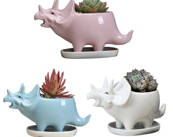 Vanenjoy Cute Cartoon Dinosaur Ceramic Succulent Planter Water Culture Hydroponics Bonsai Cactus Flower Pot Air Plant Vase Holder Desktop Decorative Organizer Triceratops With Hole Blue